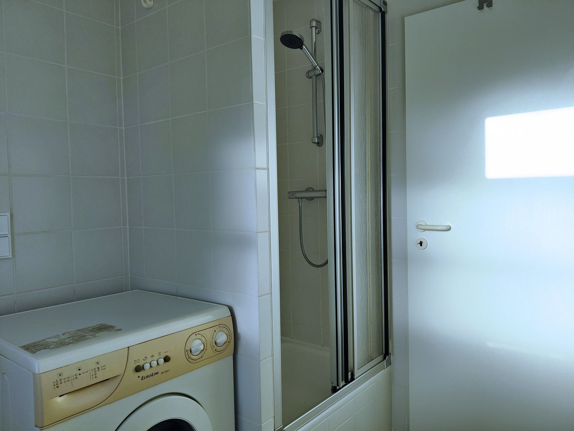 Das Badezimmer befindet sich im 1. Obergeschoss und umfasst neben Waschbecken, Toilette und Dusche auch die Waschmaschine.