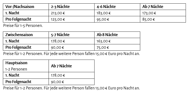 Die Preise beziehen sich jeweils auf die Miete des Ferienhauses pro Übernachtung inkl. Endreinigung.